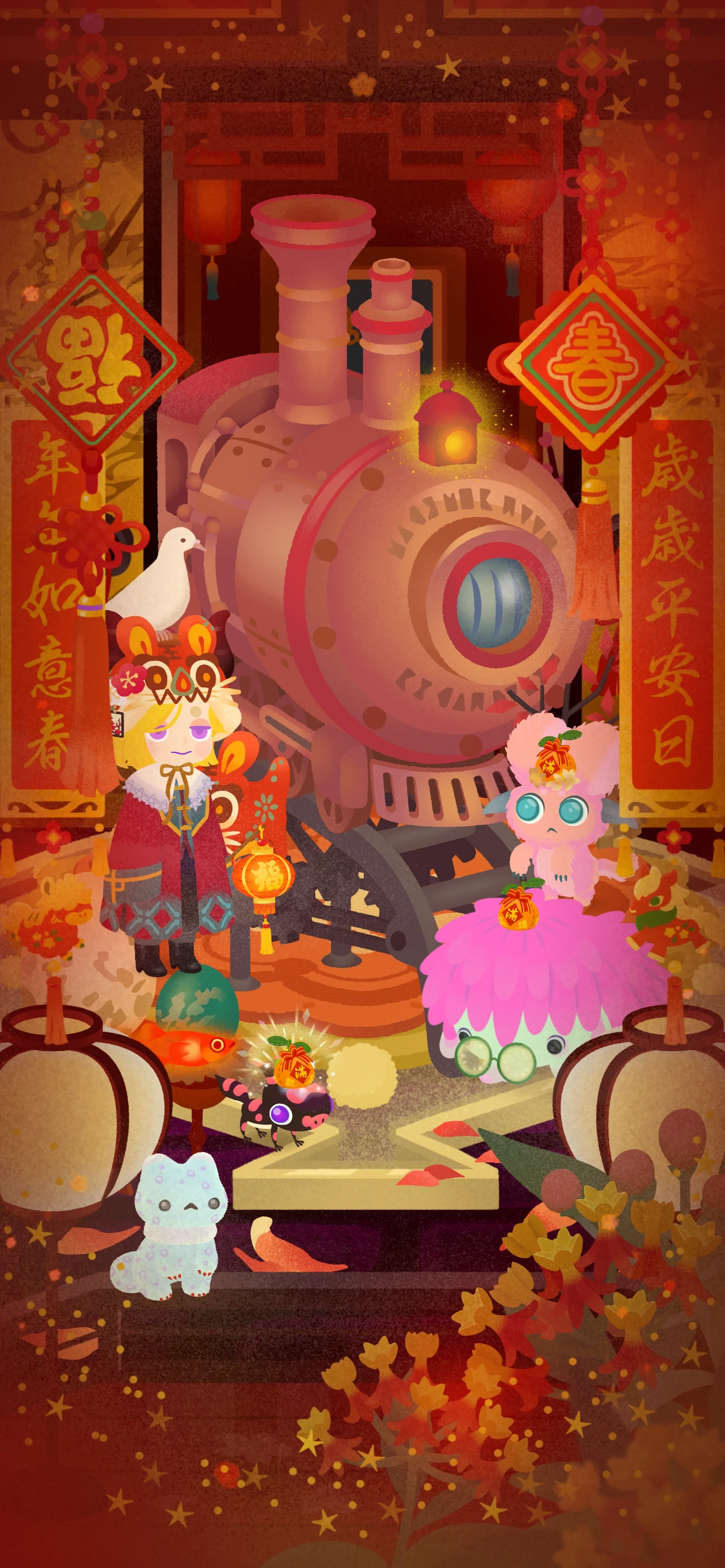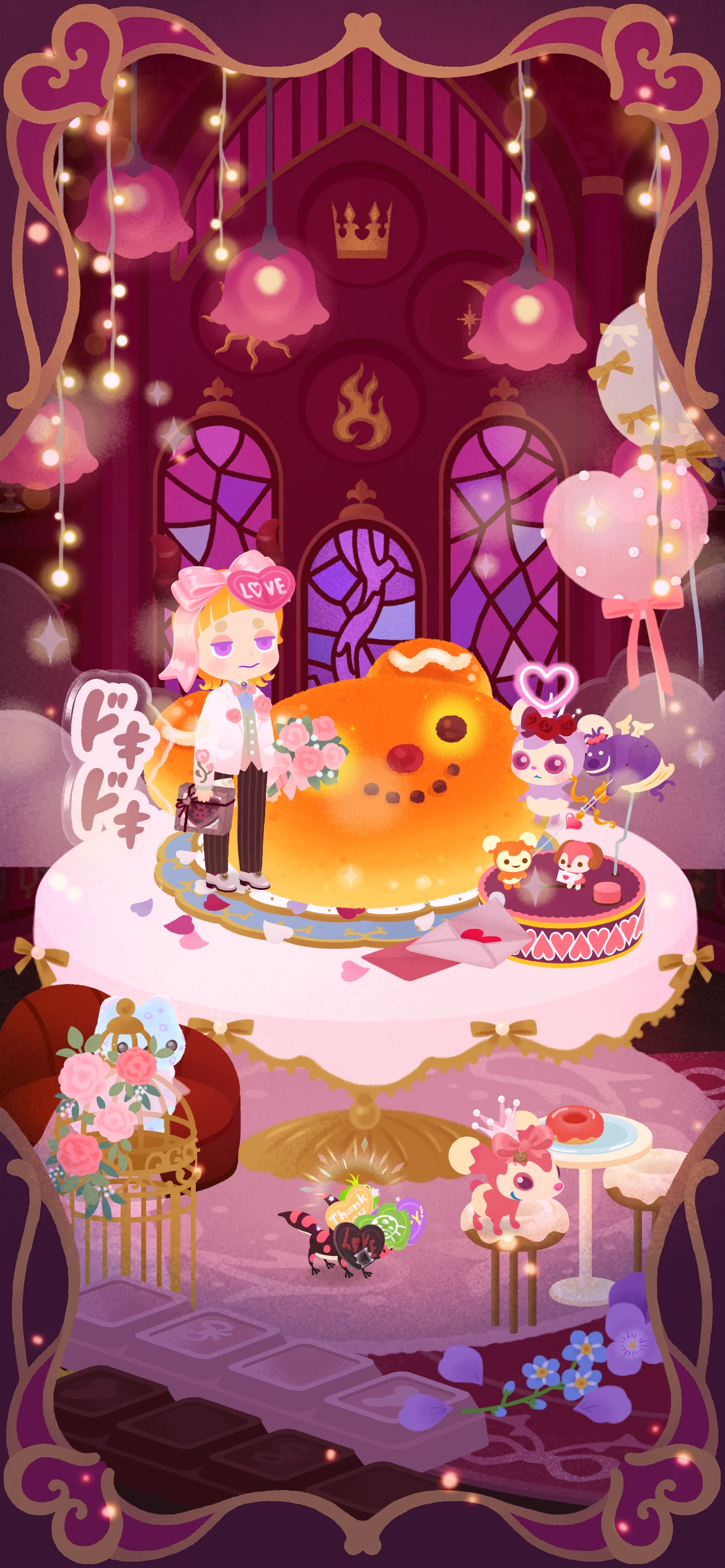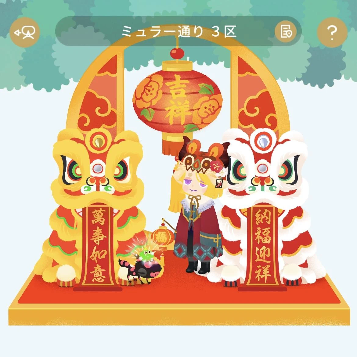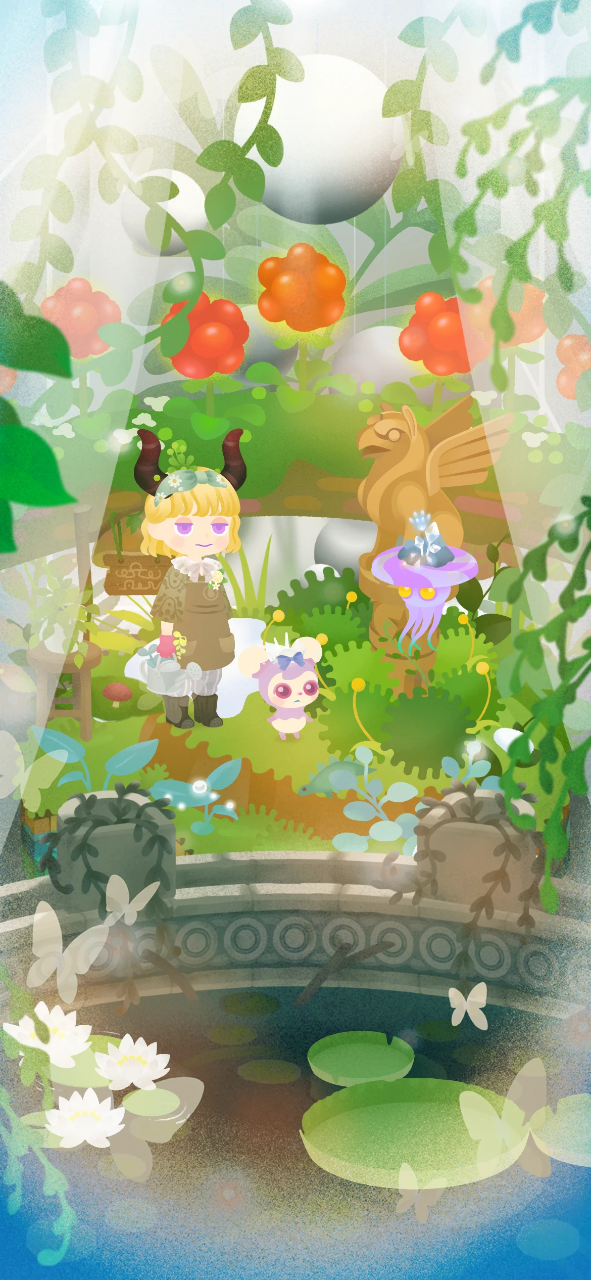 濃い緑のアイテムが多いガチャだったけど、バレンタインにフレンドさんからもらったフェンスの「天体のモニュメント」を使いたくて温室風にしてみたよ
